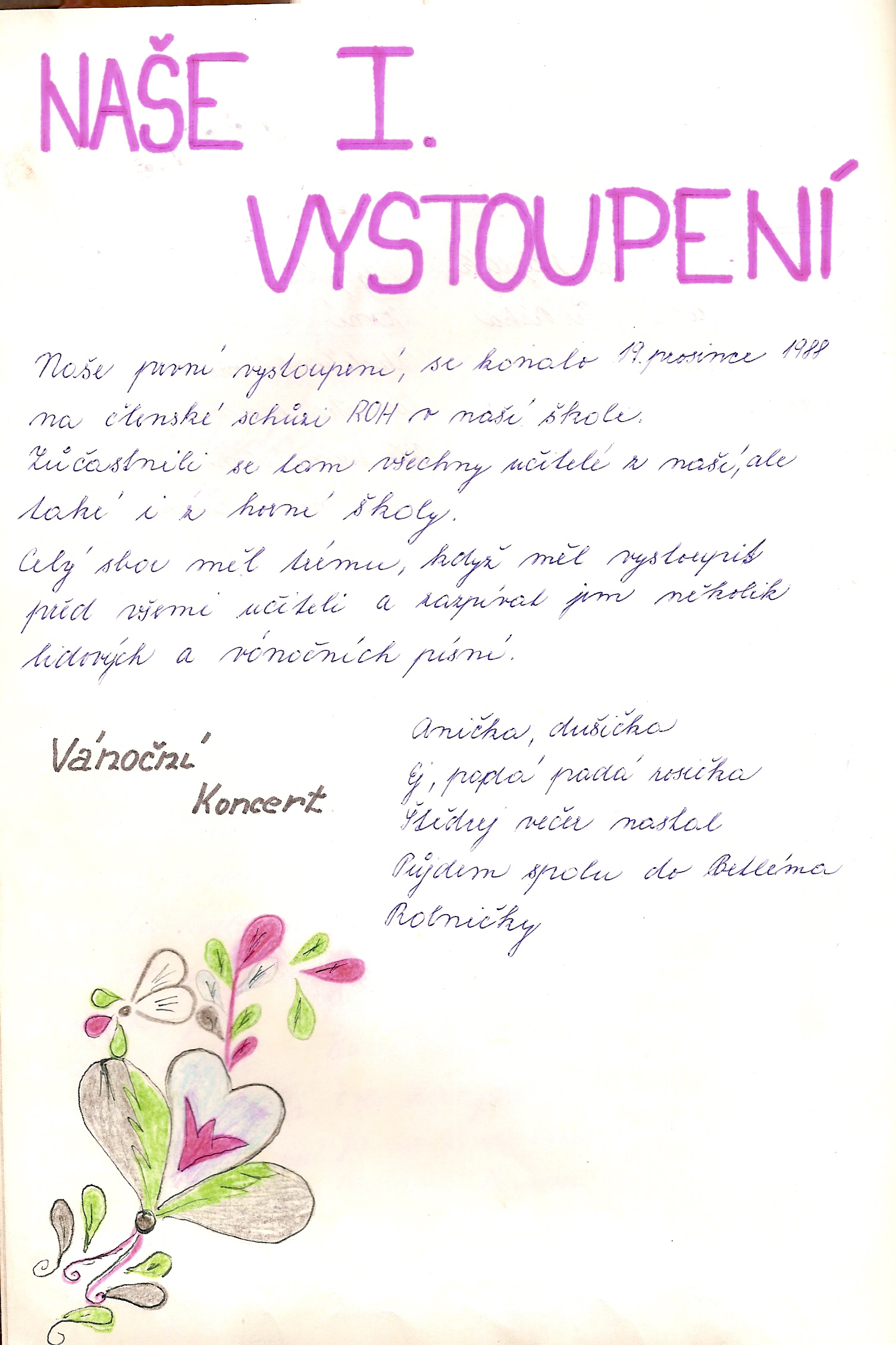 seznam členů| 19. 12. 1988 | První vystoupení – ZŠ 28.října 581 |