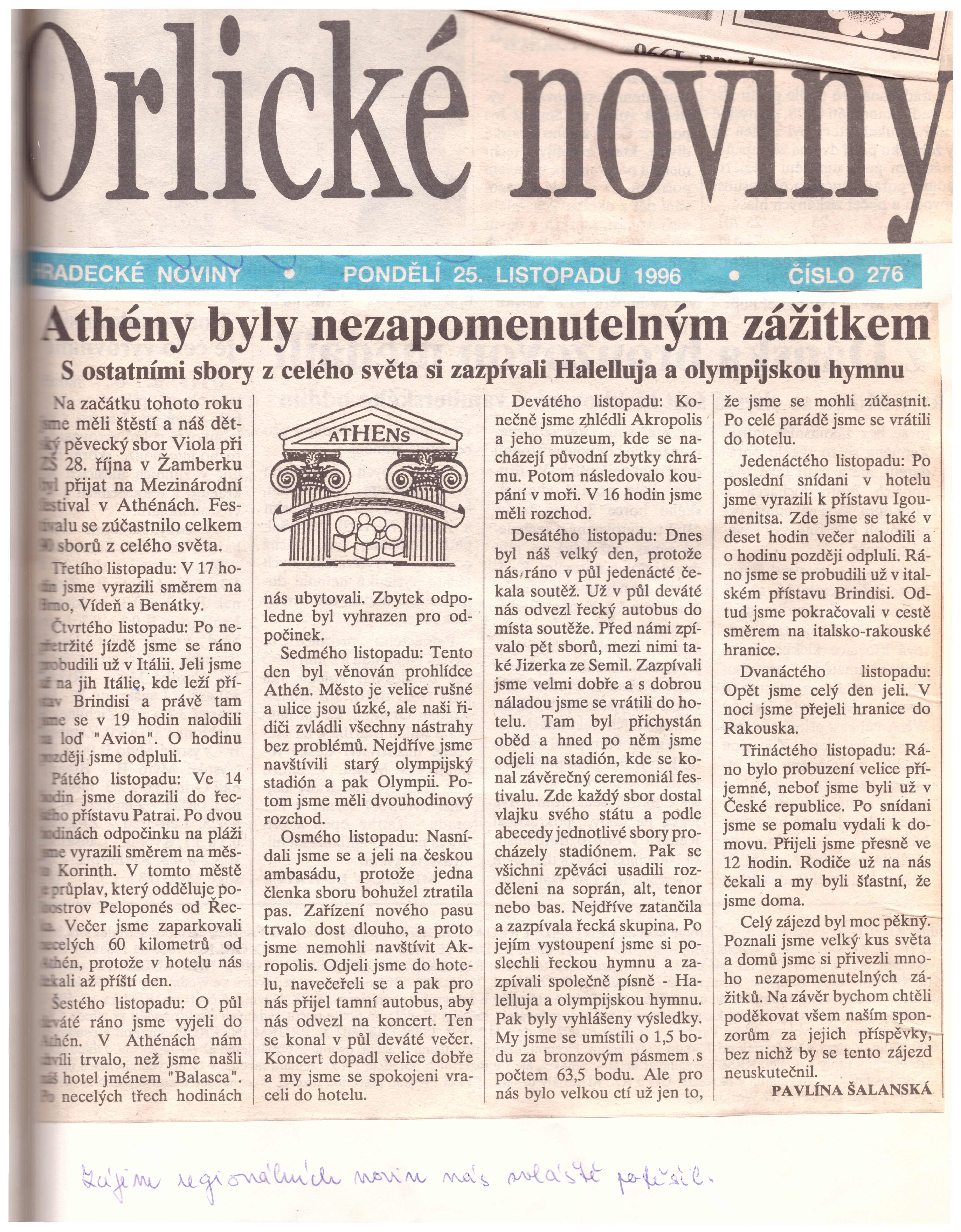 10. 11: To byl náš velký den, protože nás čekala soutěž. Už v půl deváté nás odvezl řecký autobus do místa soutěže. Před námi zpívalo pět sborů, mezi nimi také Jizerka ze Semil.