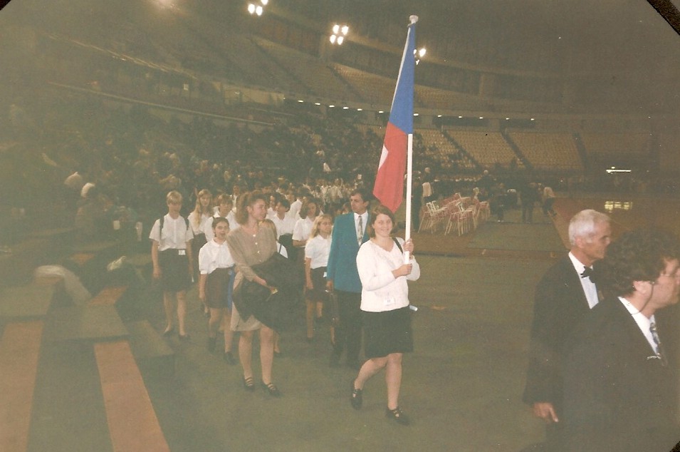 Tam každý sbor dostal vlajku svého státu a podle abecedy jednotlivé sbory procházely stadionem. Pak se všichni zpěváci usadili rozděleni na soprán, alt, tenor a bas.